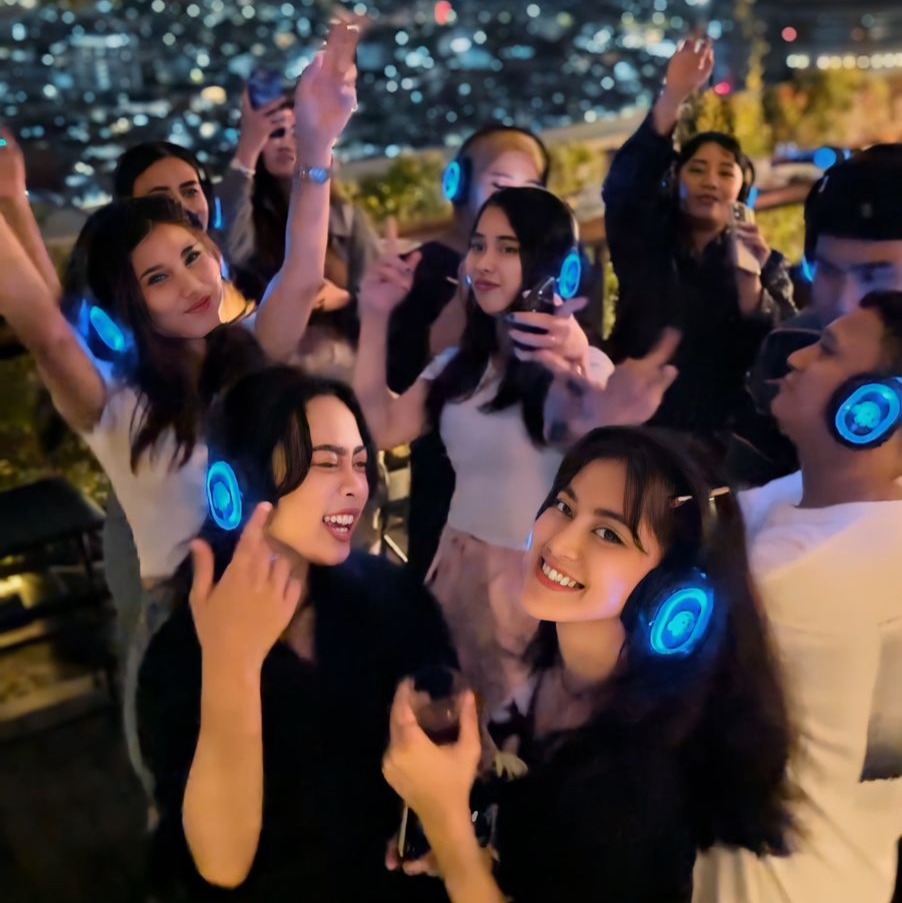 Konsep Silent Party melibatkan pengunjung yang menggunakan headphone nirkabel. Atmosfer yang hening dan mendalam ini menciptakan pengalaman luar biasa, menjadi cara yang berbeda untuk menghabiskan malam sabtu. Hanya dengan Rp 150.000 nett/pax, tamu bisa mendapatkan pengalaman yang unik dan bisa menyantap BBQ Buffet yang disediakan.